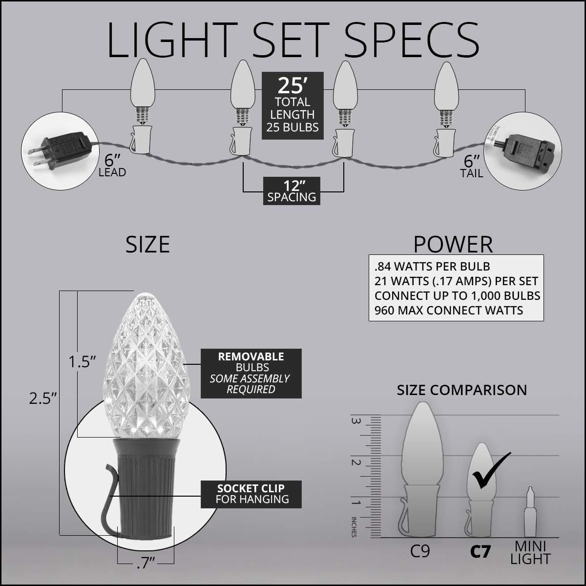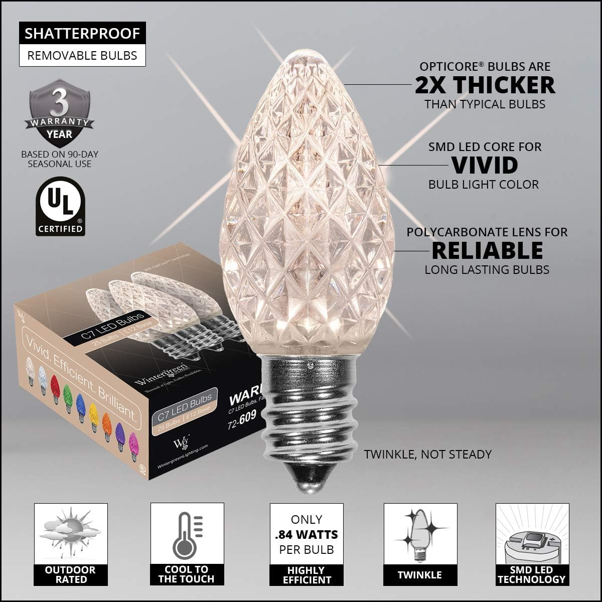 - 25 high-performance Opticore C7 LED bulbs with soft warm white twinkle