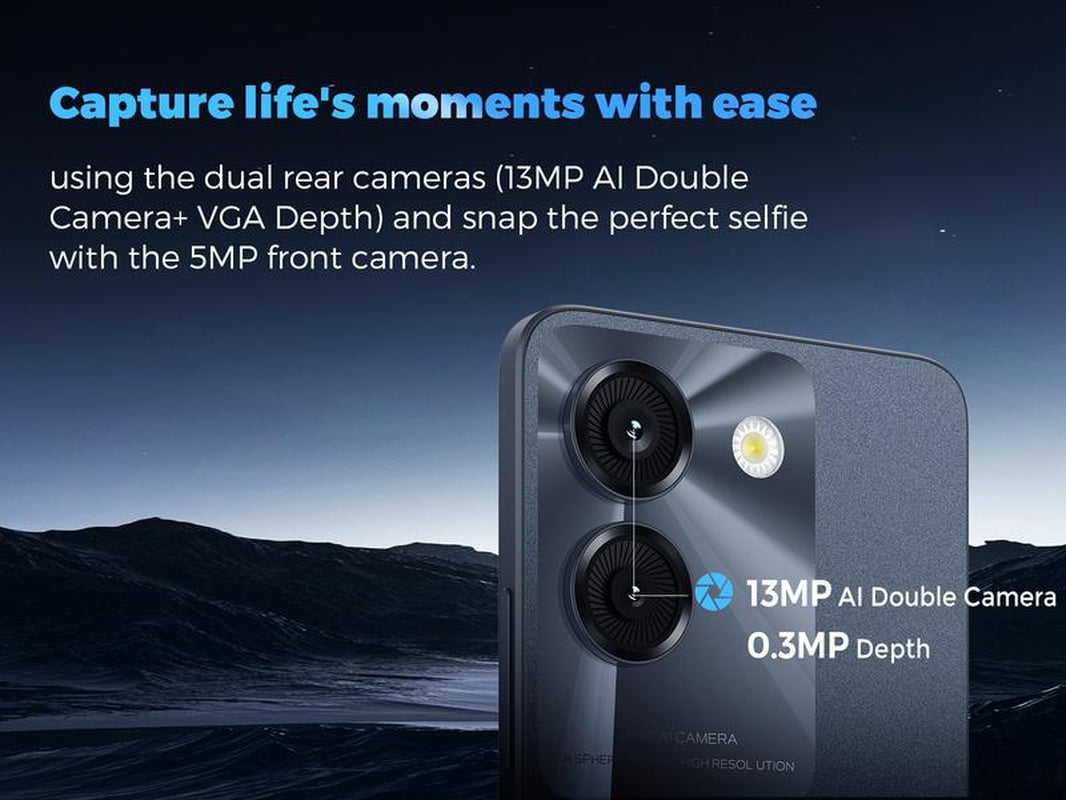 Equipped with 8GB RAM and 64GB storage, the Miro Phone A67 provides ample space. The rear features a 13MP AI Dual Camera and a 0.3MP Depth Sensor for stunning photos. The front boasts a 5MP fixed-focus camera, ideal for selfies and video calls.