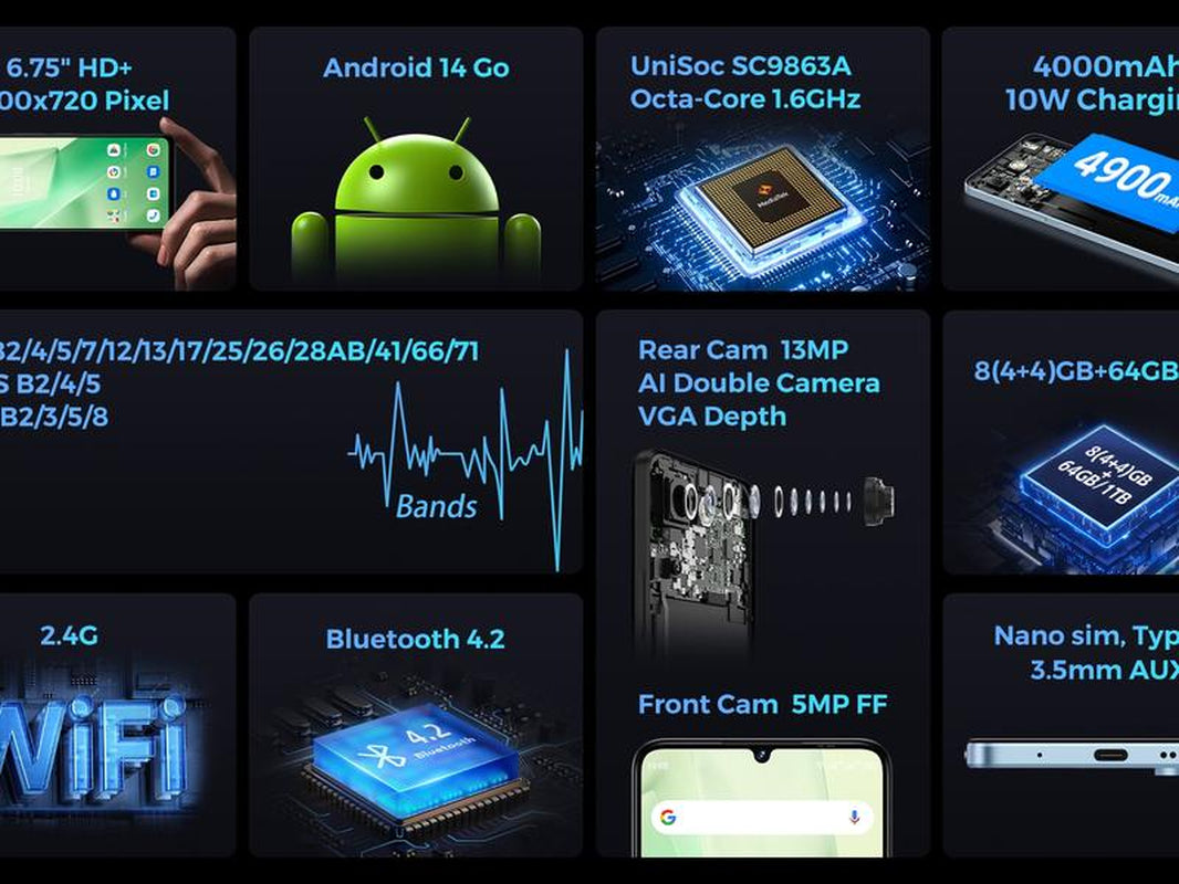 The UniSoc SC9863A Octa-Core 1.6GHz processor ensures swift performance. It runs Android 14 Go Edition, offering a seamless user experience. The 6.75-inch Water Drop HD+ screen delivers vibrant visuals with a 1600x720 resolution. This smartphone is perfect for multimedia and daily tasks.